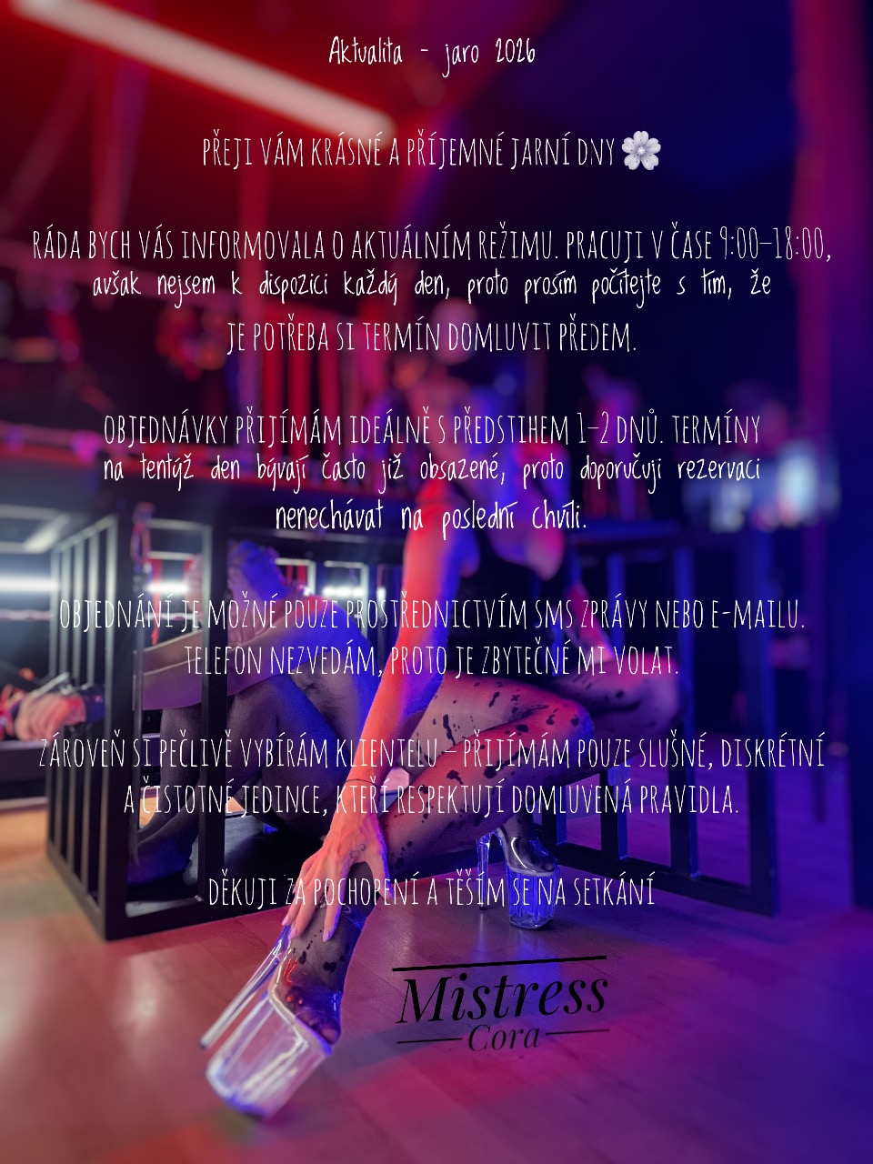 Přijmu tě vždy s úsměvem, ale pozor na mě! Jakmile začne naše společná lekce, veškerá sranda a úsměvy jdou stranou. Miluji, když se mohu dívat, jak se ti třesou kolena, kdykoliv se na mě podíváš, přitom ale víš, že pohled máš za odměnu, protože jsi jen pouhou nickou a tvůj pohled musí směřovat přímo k zemi, tam, kam patříš! Jsem tvojí pevnou rukou, která ti nakáže co a jak.